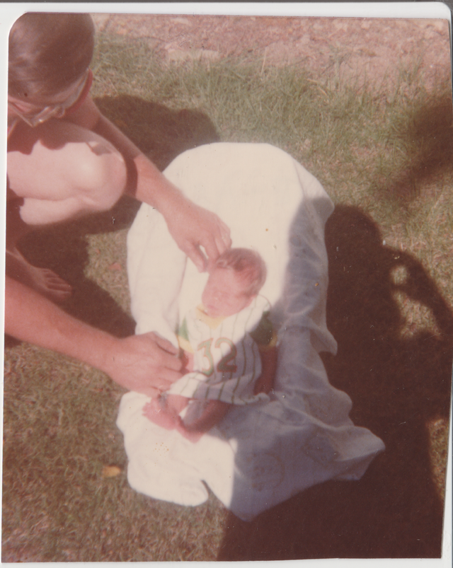 1980-07-05 - Saturday - July - Katie Jean Arnold - 12 days old - in July of 1980 in Lake Oswego, Oregon, USA, with her parents, Marilyn Kathleen Mitchell, AKA M&M Morehead, and In A Heart Beat Donald Melvin Arnold (Rasp). Katie is wearing a number 32 baseball jersey shirt, it appears, in this picture. People wore short shorts in the 1970's and maybe even in the 1980's as well. This was back when Star Wars, Rambo, Hulk Hogan, Michael Jackson, & home computers, were very new.