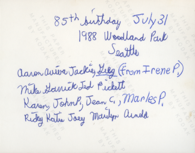 Mom's mom's mom, Ann Pickell Pickett, was turning 85 years old. So, probably on Friday, the 29th of July of 1988, we went to Seattle to celebrate her birthday. I was three years old and it was my first time to Seattle. I remember going into probably Karen's car. I remember the road trip, the bridges and buildings. I remember a park with many steps. I saw a piano. I remember being in the swimming pool. We played games. They were holding me up. We went to the Woodland Park in Seattle. People in that photo includes mom, Marilyn Morehead Arnold Mitchell, me, my two siblings, Katie and Ricky; also, Aaron, Greg, (from Irene Pickett or Pickell), Mike, Ted, Karen Williams, John P, Jean C, Marles P.