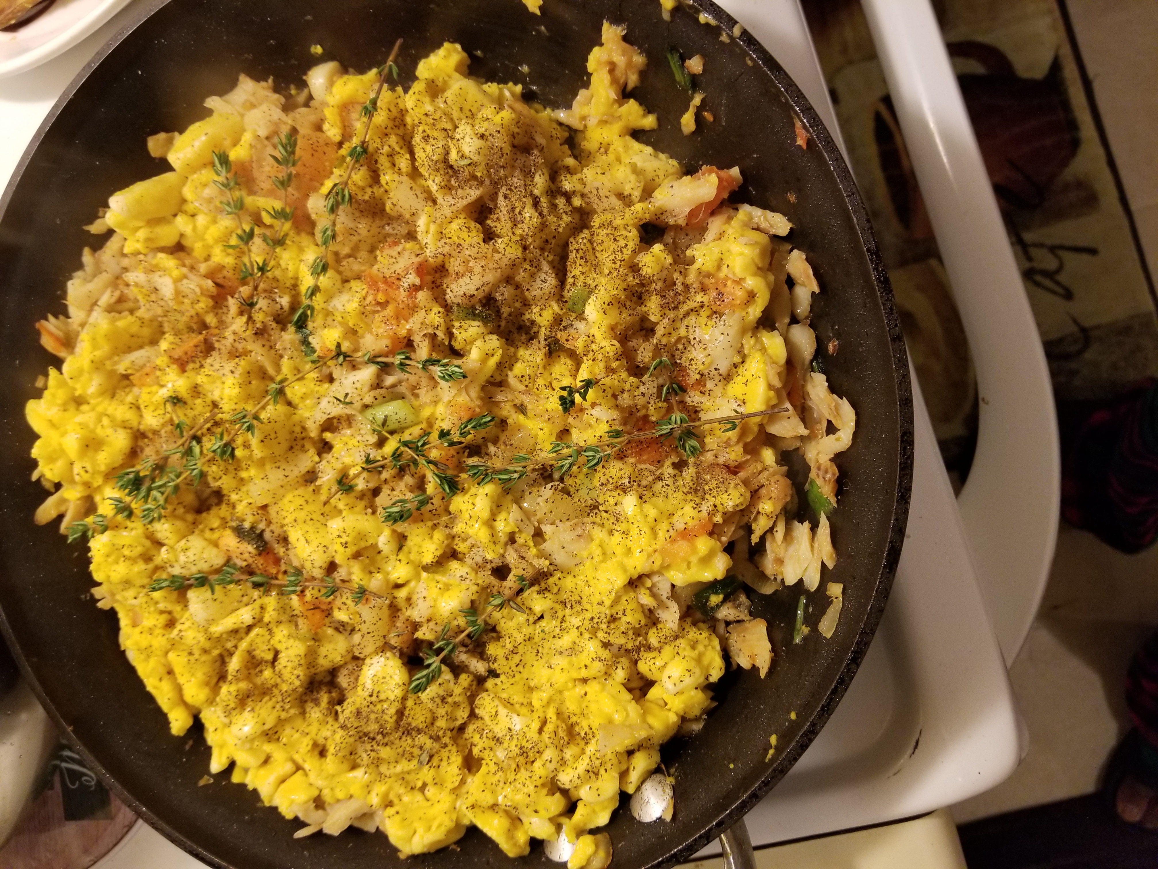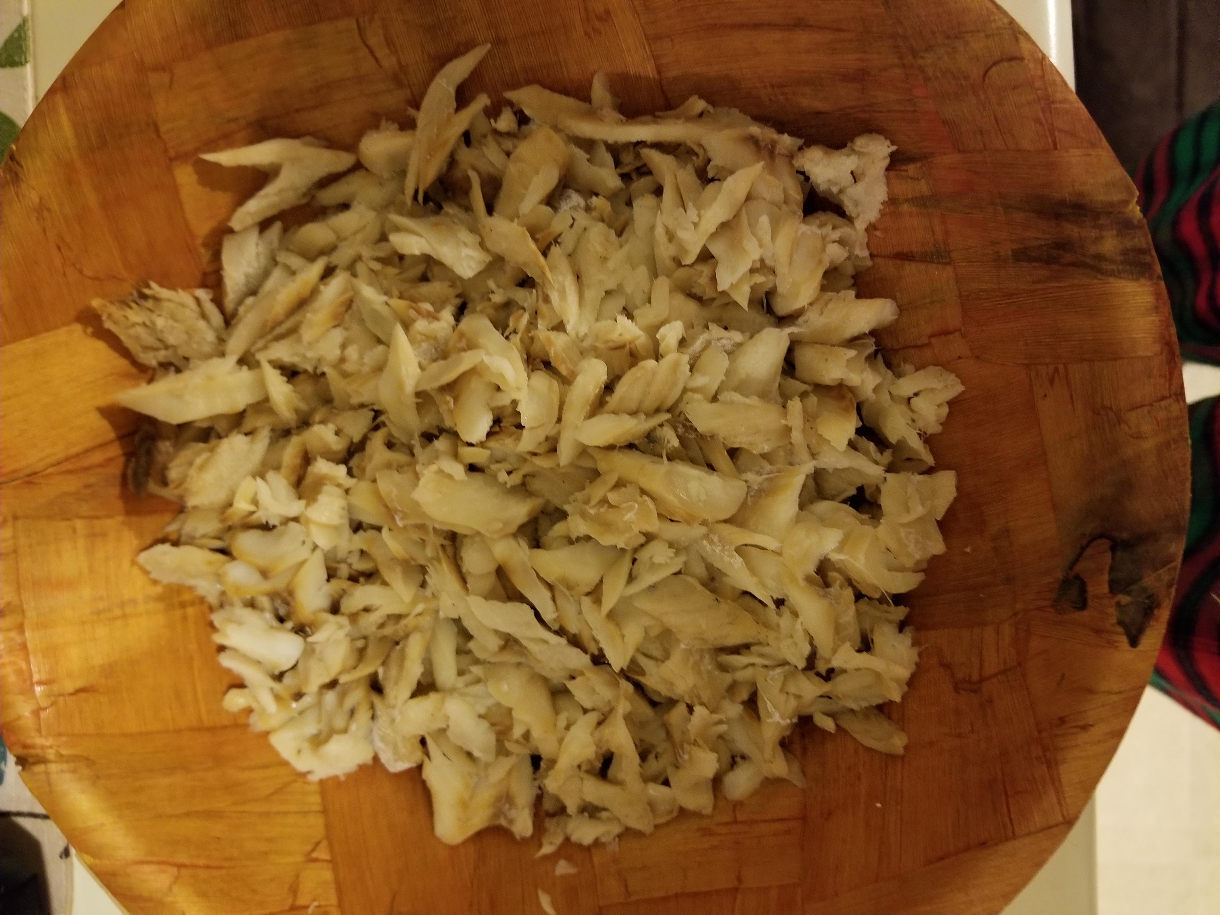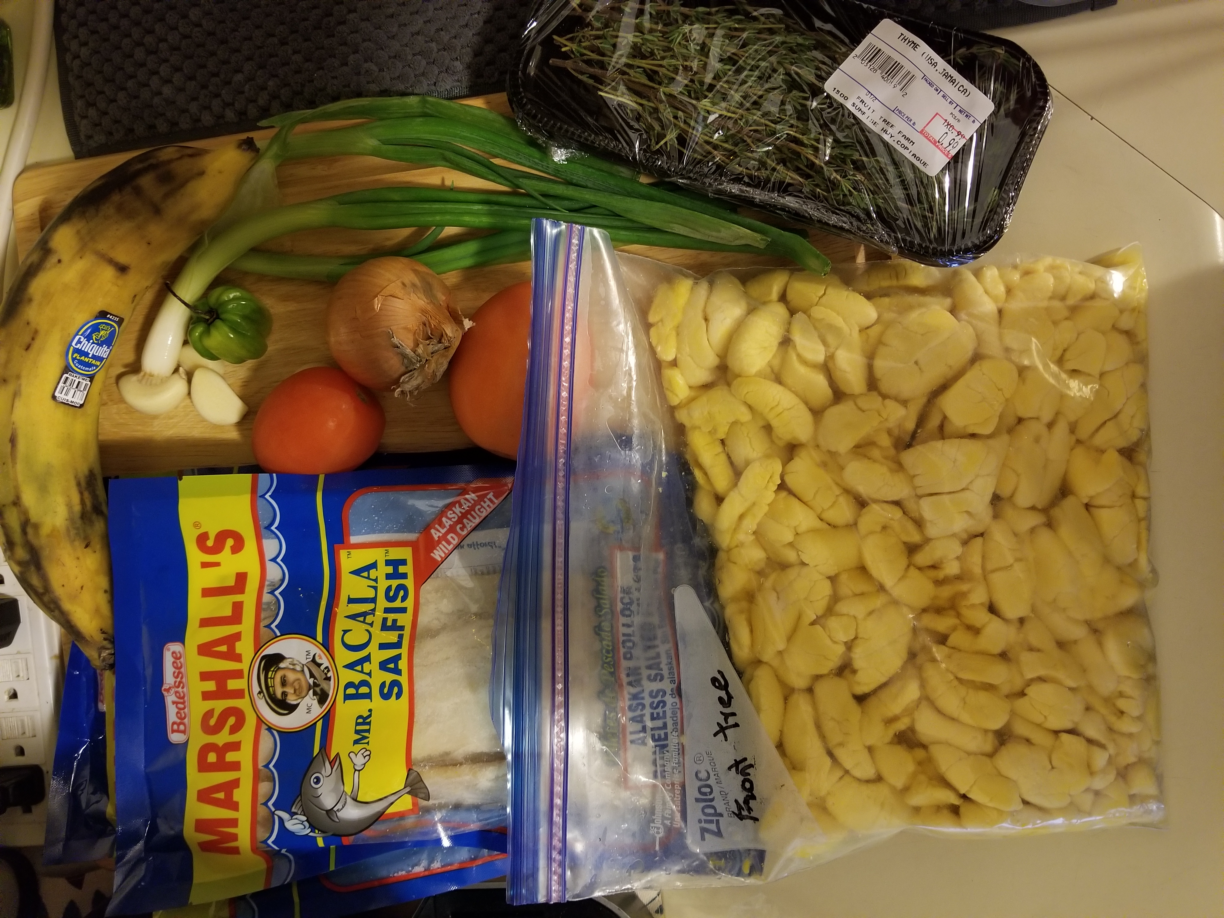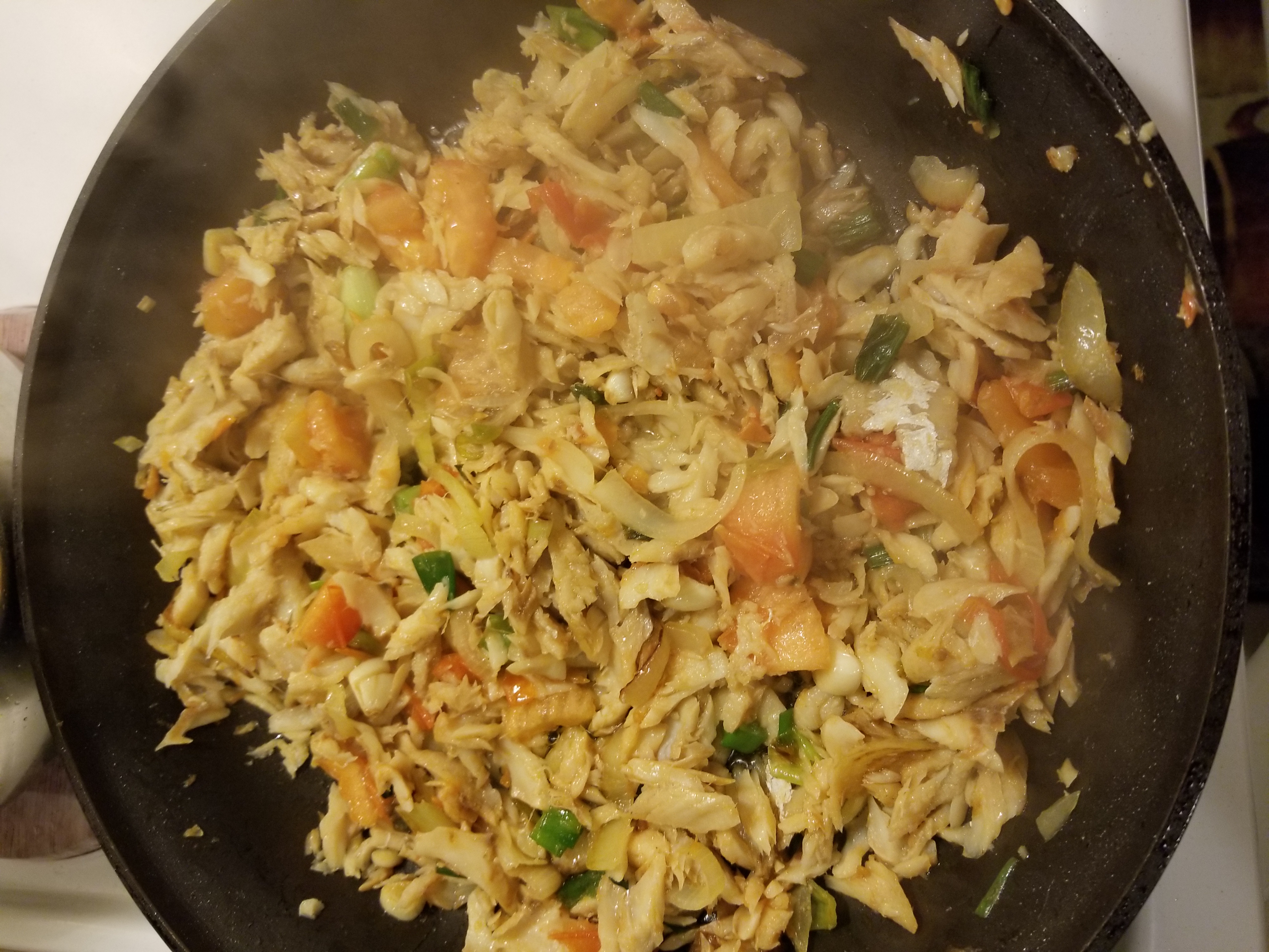 Saltfish mixed up with the scallions, tomato, scotch bonnet pepper, onion, and garlic.