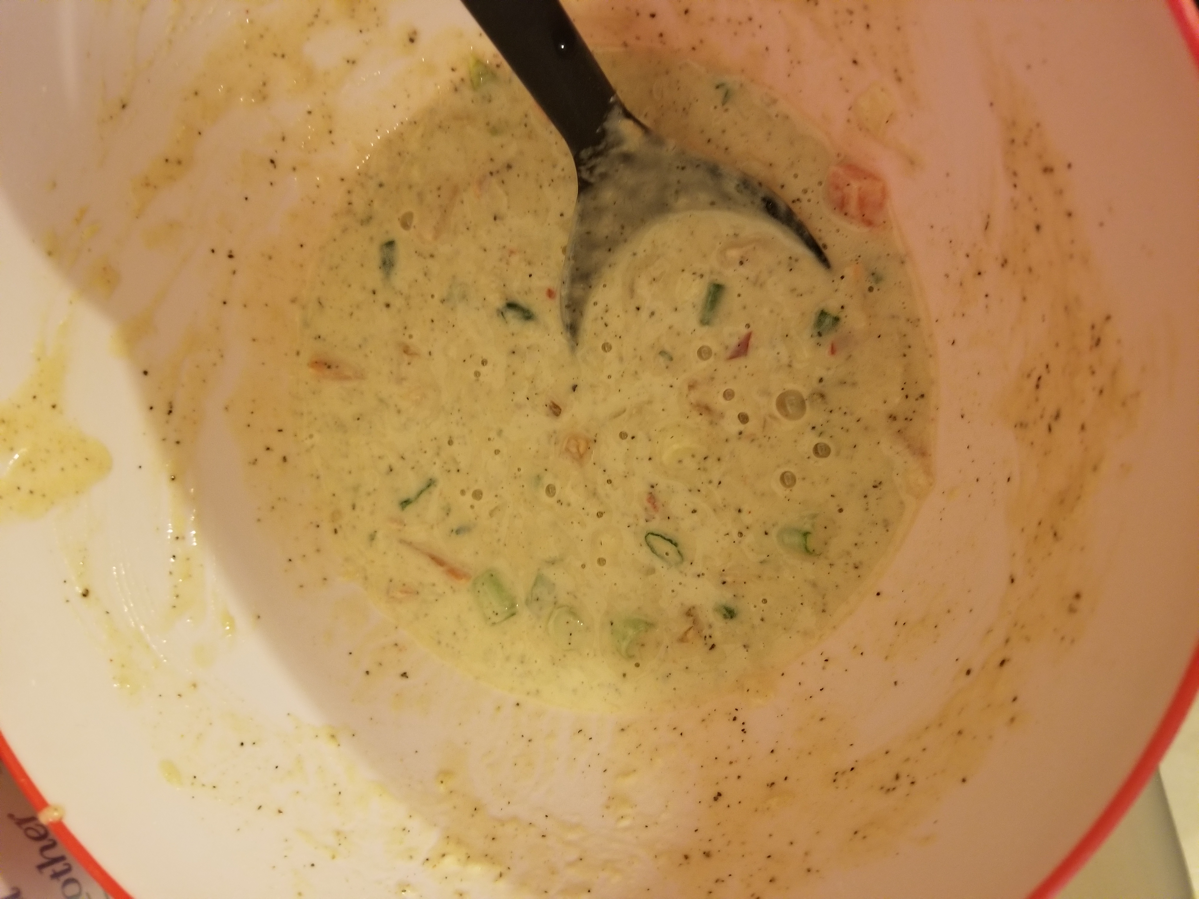A cup of flower, black pepper, salt, baking powder. Add the saltfish, tomatoes, etc. Then add some water and an egg and mix. Spoon mixture into hot oil.