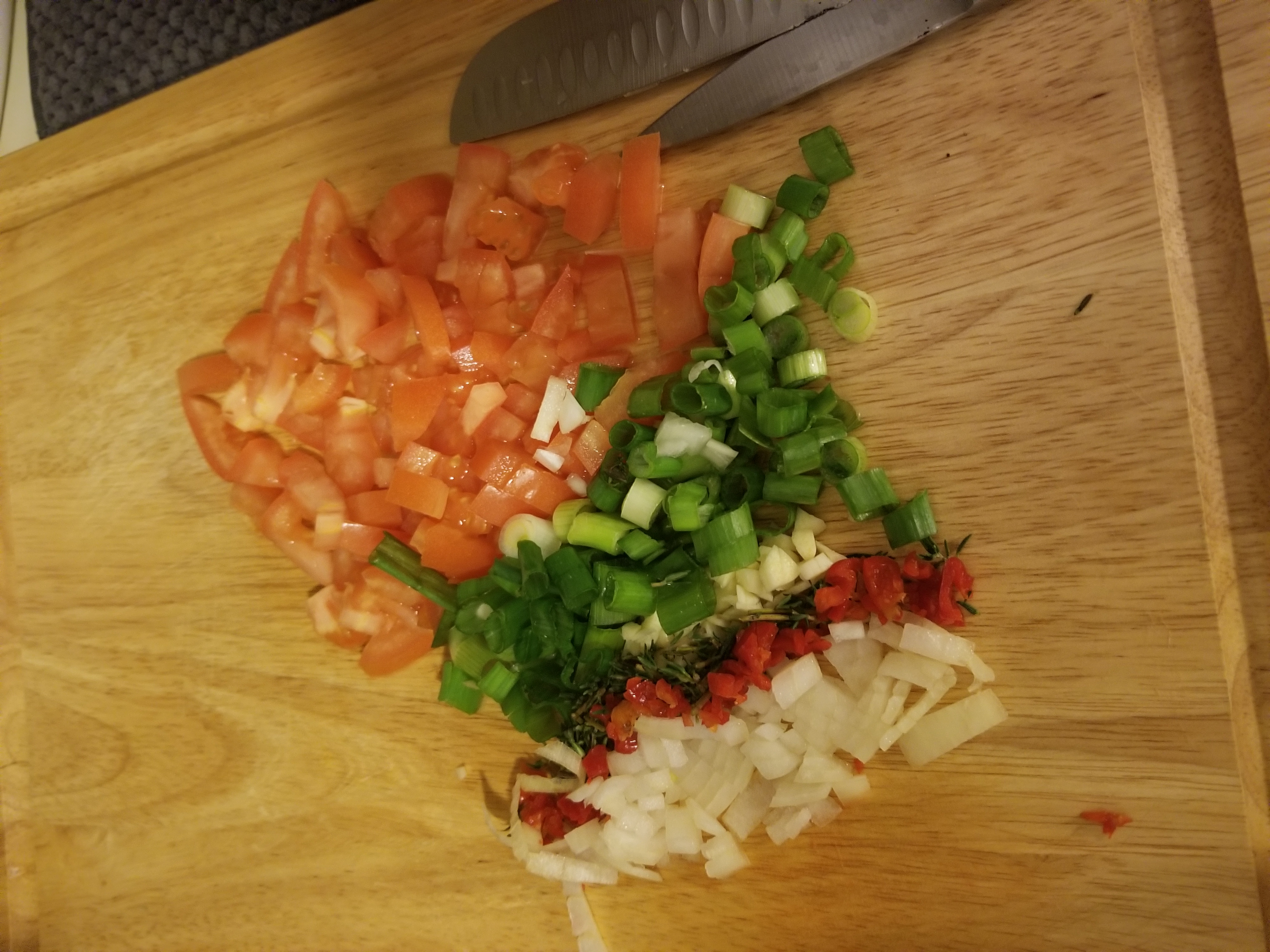 Diced tomatoes, scallion, thyme, scotch bonnet pepper, garlic and onion.