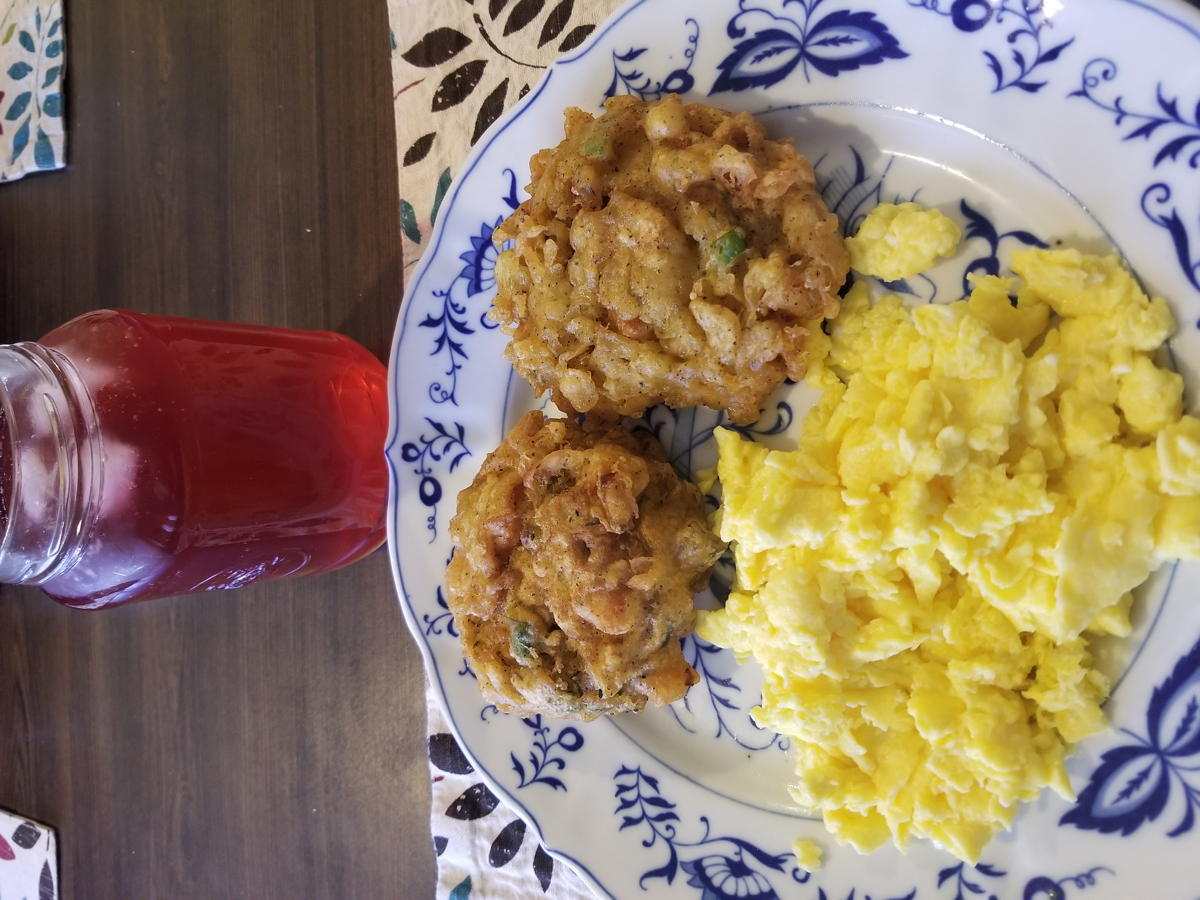 Finished product. Saltfish fritters, scrambled eggs, and a cold glass of sorrel juice. Wifey loved Sunday morning breakfast.