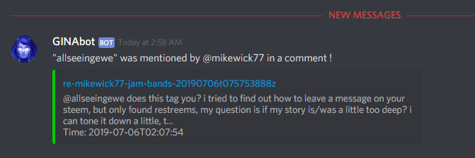 @allseeingewe does this tag you? i tried to find out how to leave a message on your steem, but only found restreems, my question is if my story is/was a little too deep? i can tone it down a little, thought you all liked stories?