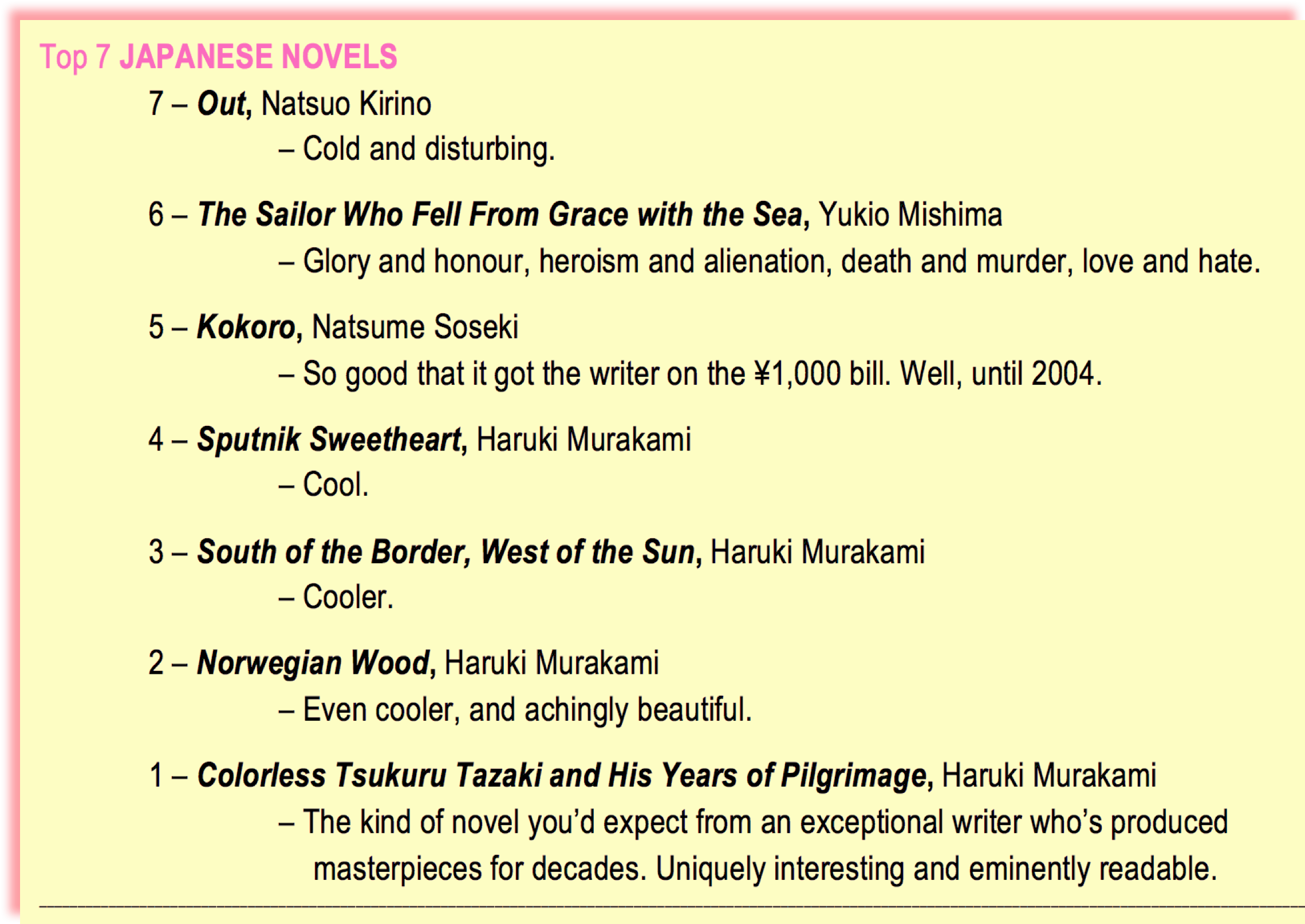 41 – Top 7 Japanese Novels (Right-click to see my original post) "Murakami’s novels will have a staying power similar to that of the greatest Beatles albums."