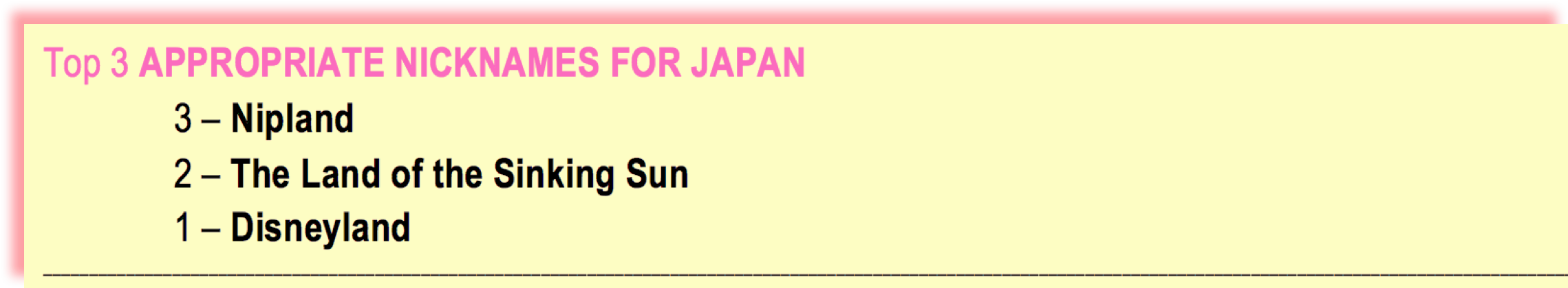 3 – Top 3 Appropriate Nicknames for Japan (Right-click to see my original post) "We smiled ... and continued watching the floating world drift by."