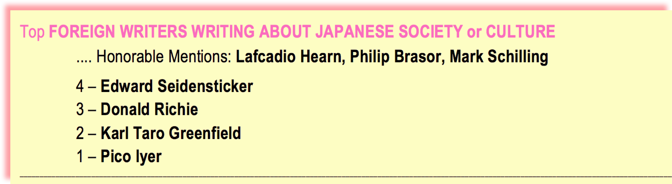 43 – Top 4 Foreign Writers Writing about Japanese Society or Culture (Right-click to see my original post) "From the idiosyncrasies of the culture, to the banal shenanigans of the bike gangs who feebly 'terrorize' quiet neighborhoods."