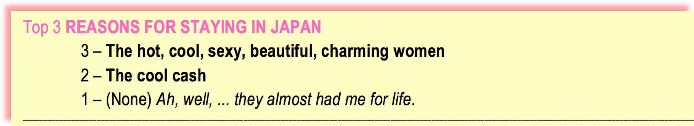 1 – Top 3 Reasons for Staying in Japan (Right-click to see my original post) "An enticing blend of ancient traditions with ultramodern contraptions and amusements. ... And women. ... And money."