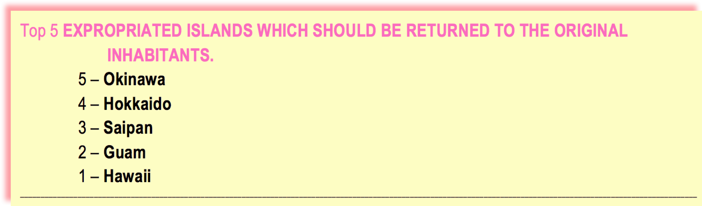 15 – Top 5 Expropriated Islands that Should Be Returned to the Original Inhabitants (Right-click to see my original post) "The Japanese stole Hokkaido, subjugated Okinawa, and rented Hawaii, on a long-term basis."
