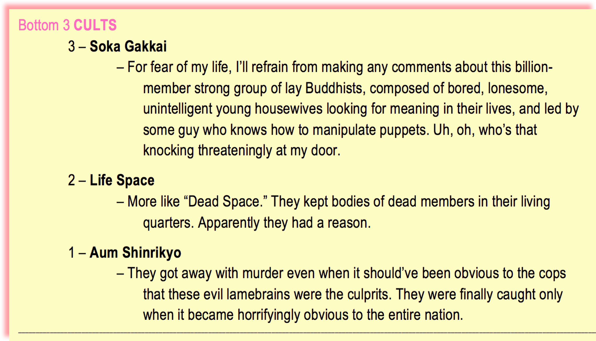 21 – Bottom 3 Japanese Cults (Right-click to see my original post) "Wreaking havoc by killing and spreading poison in peaceful neighborhoods."
