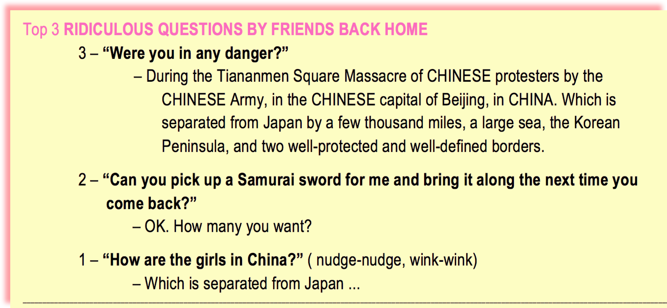 5 – Top 3 Ridiculous Questions by Friends Back Home (Right-click to see my original post) "Damn, this country is pretty screwed up."