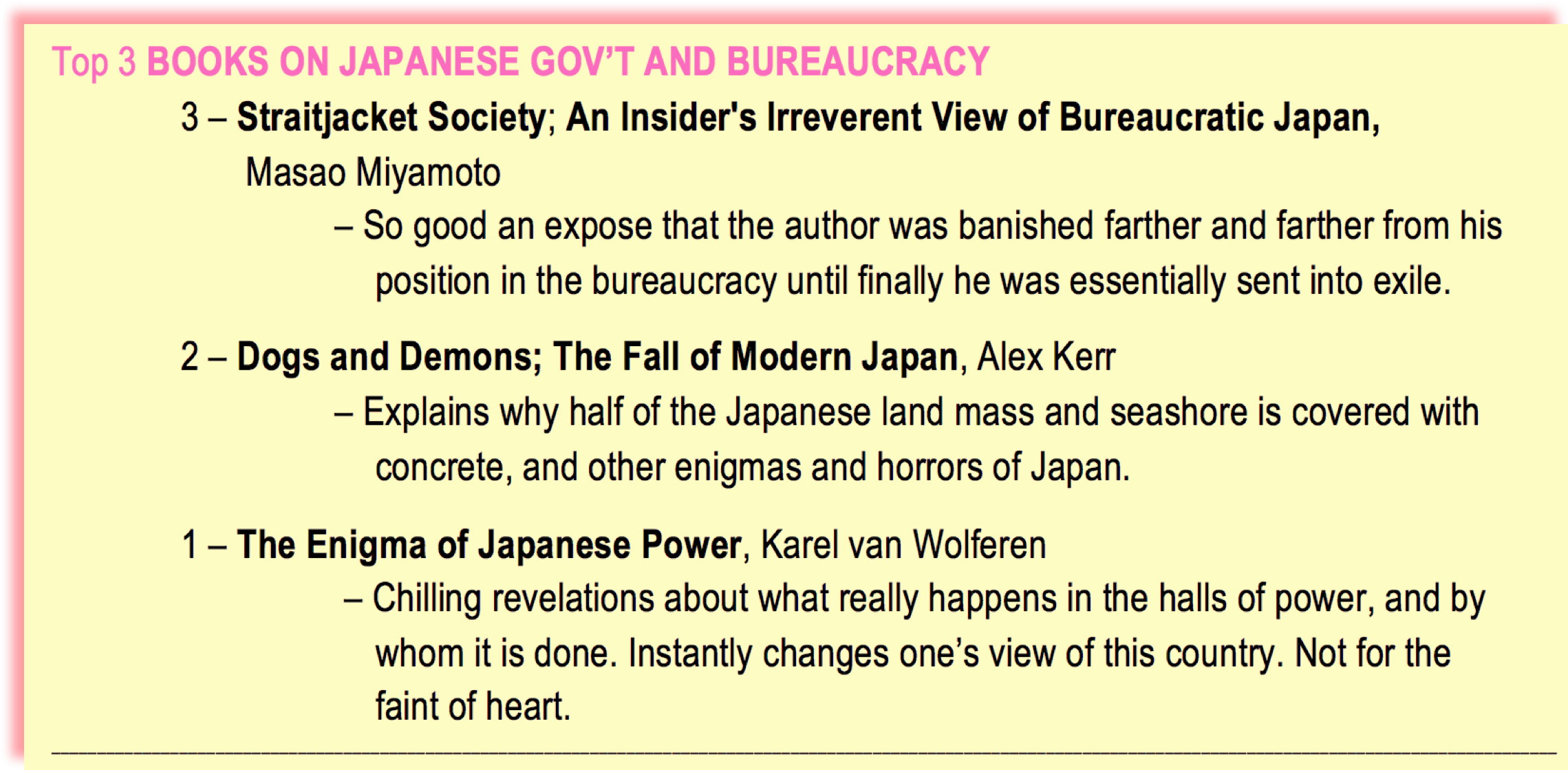 44 – Top 3 Books on Japanese Government and Bureaucracy (Right-click to see my original post) "Chilling revelations about what happens in the halls of power. ... Not for the faint of heart."