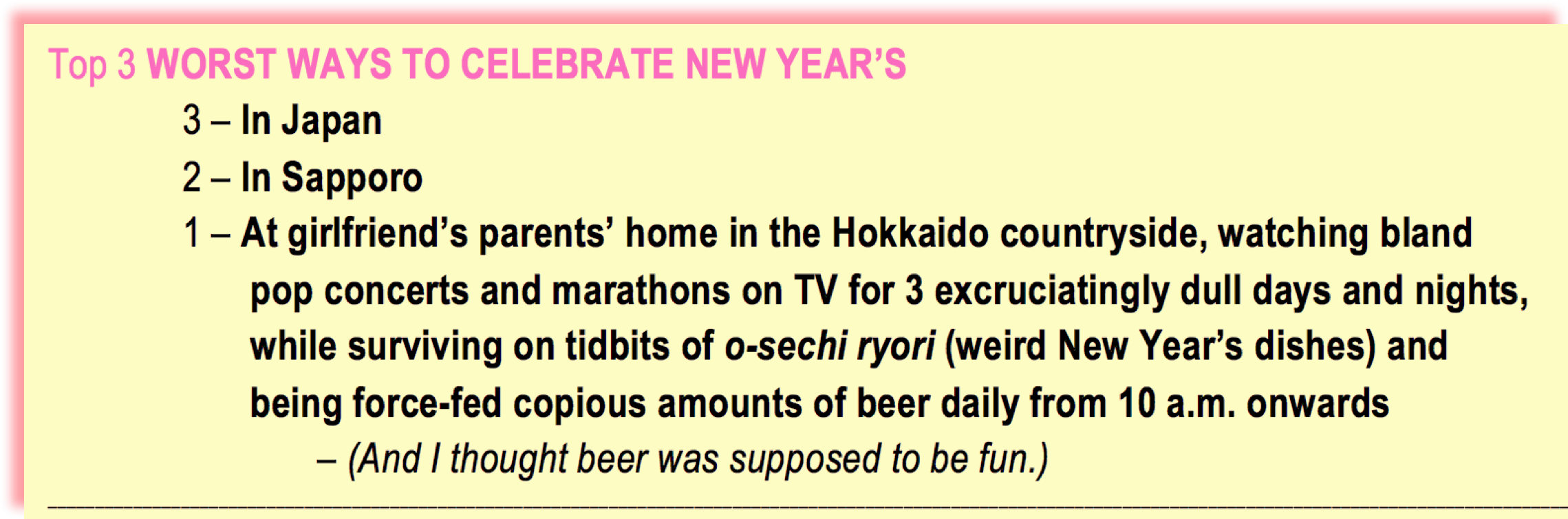 11 – Top 3 Worst Ways to Celebrate New Year’s (Right-click to see my original post) "Virtually snowbound and housebound, in a remote, nondescript town in the far north, with nothing to do but watch a boring marathon on TV."
