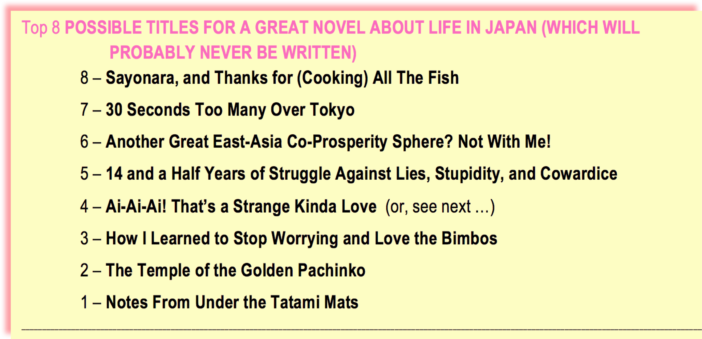 Top 8 Possible Titles for a Great Novel about Life in Japan (Notes from Under the Tatami Mats–46 … My Adventures in Japan)