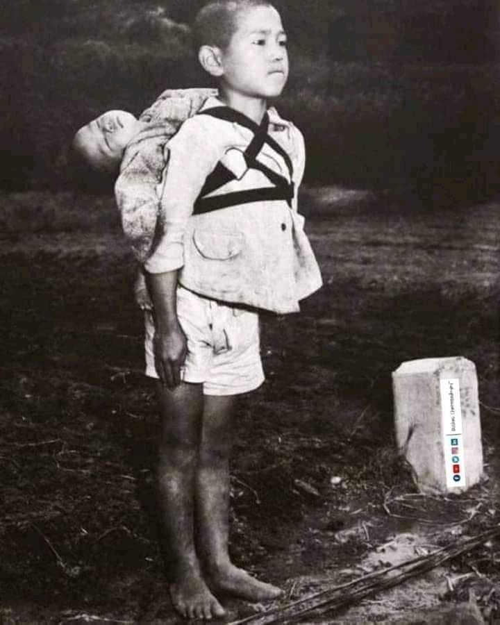 During World War II (1945), a Japanese boy stood in front of a funeral and waited his turn to burn his dead little brother.