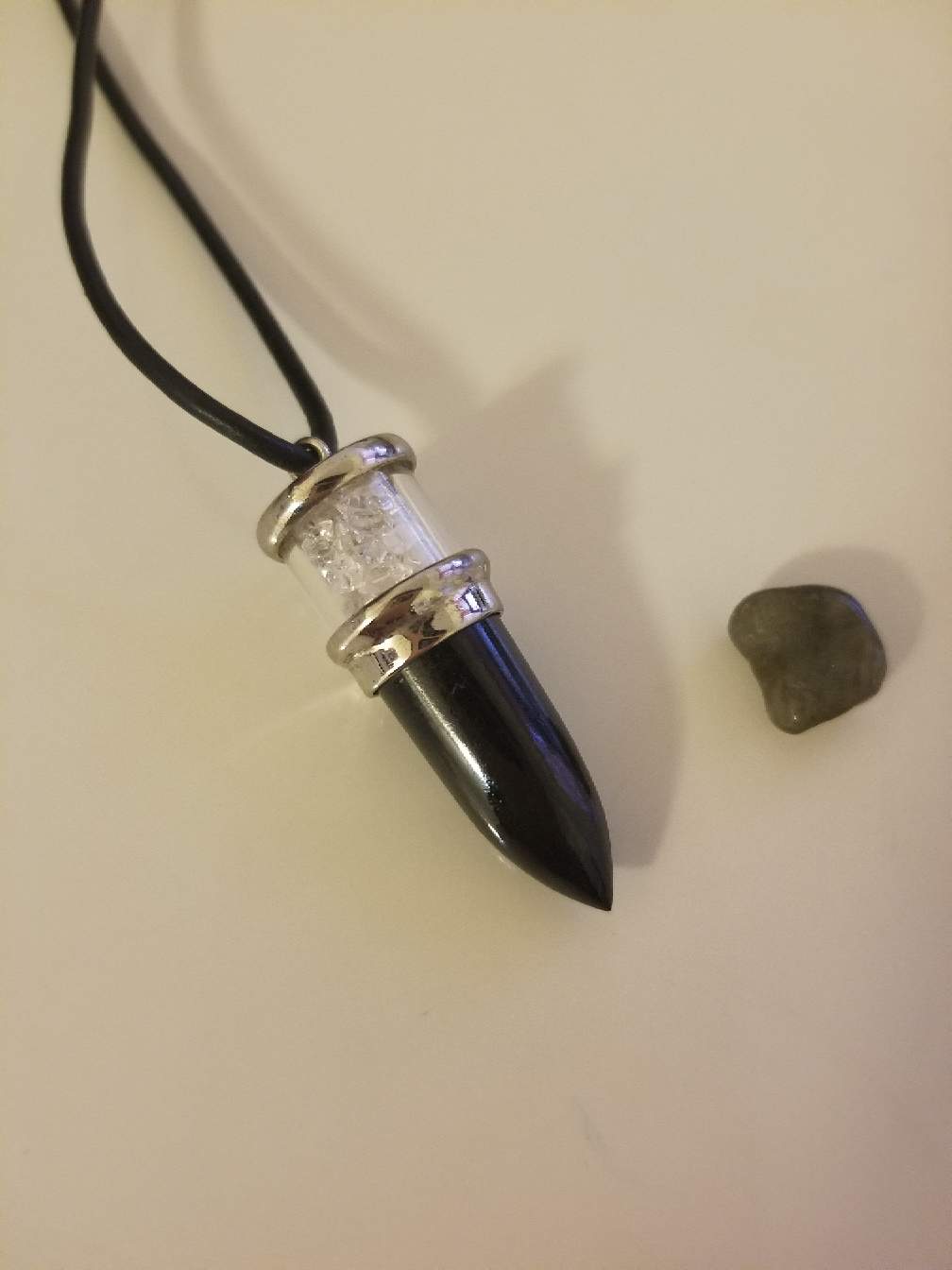 My husband told me I should get a crystal that gets rid of negative energy. I wasn't sure what it was, but we went to a crystal shop and got crystals. The first one I got is called tourmaline, it deflects all negativity. The second one is called labradorite, it makes other crystals more powerful.