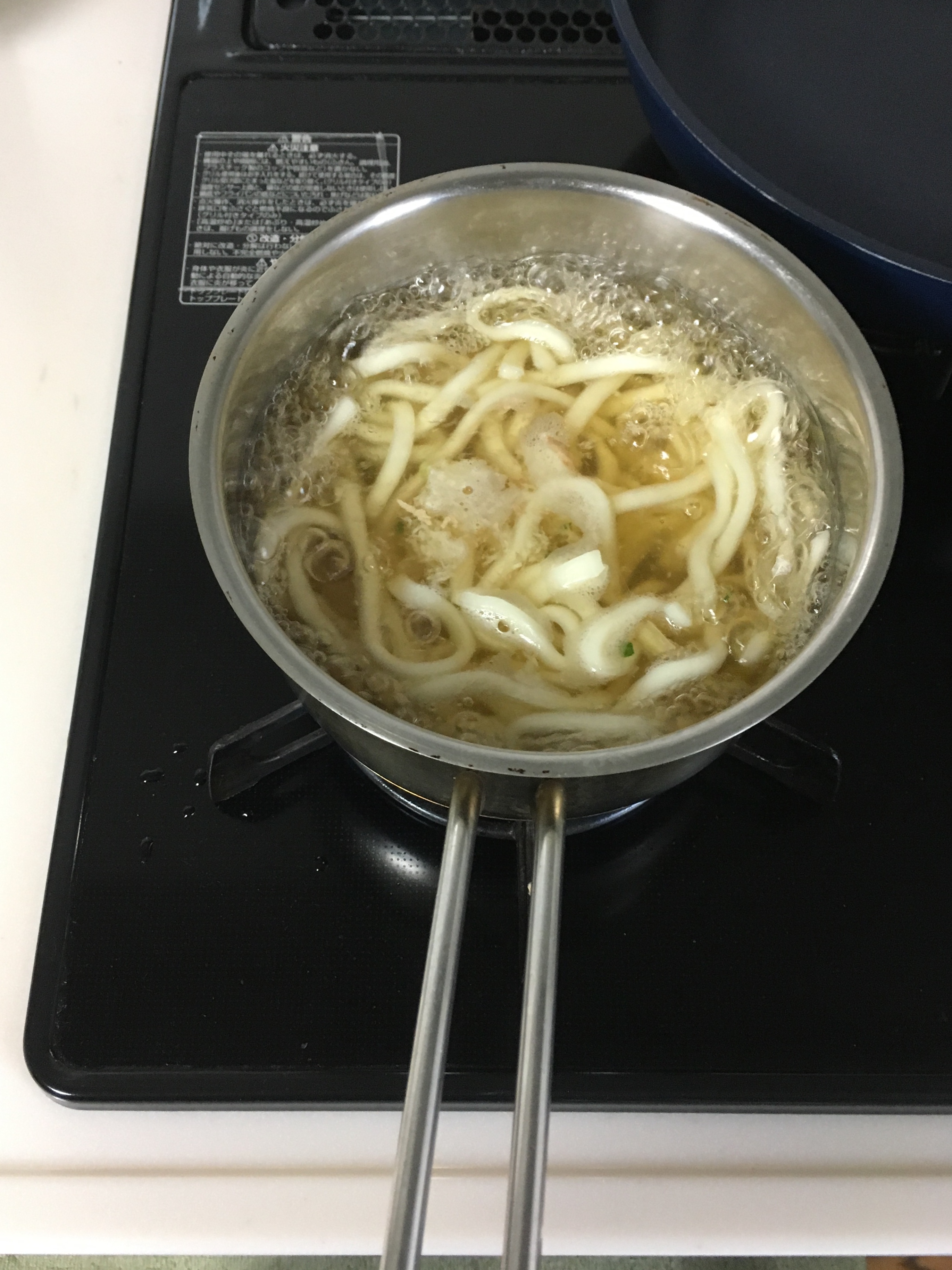 お湯を沸かし、沸騰したらうどんとだしの素を入れます。