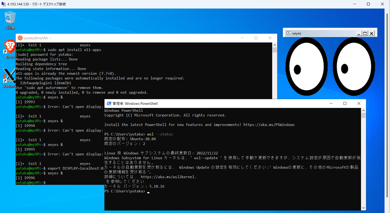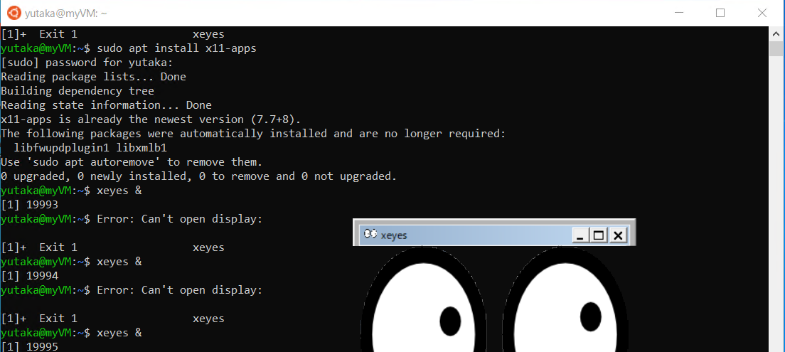 既にUbuntuをインストールしたものです。UbuntuでX11アプリの一つであるxeyes(目玉がマウスを追いかける)を起動してあります。詳細は割愛しますが、試行錯誤が少し必要になります。