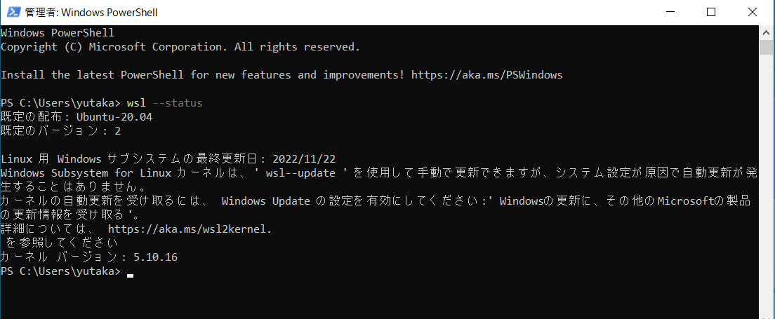 linuxのデストリビューションがUbuntu-20.04で、WSLのバージョンが2(WSL2)になっています。
