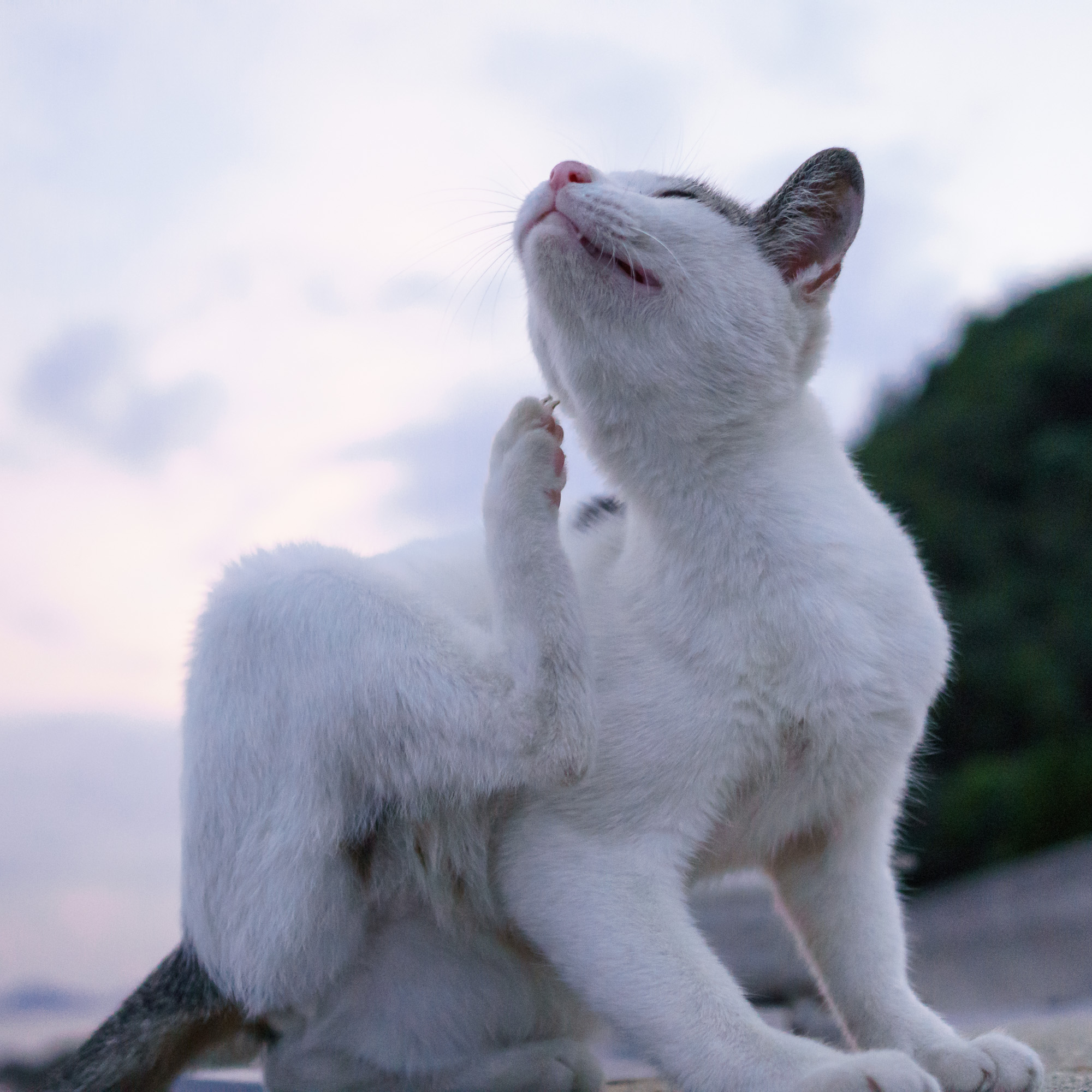 →猫たちの素早い動きをブレなく撮影するには、シャッタースピードを上げなければなりません。猫島の天気は様々。朝焼けや夕陽、曇りの日も。そんな日はシャッタースピードを落とさずに、ISO感度を上げて対応します。