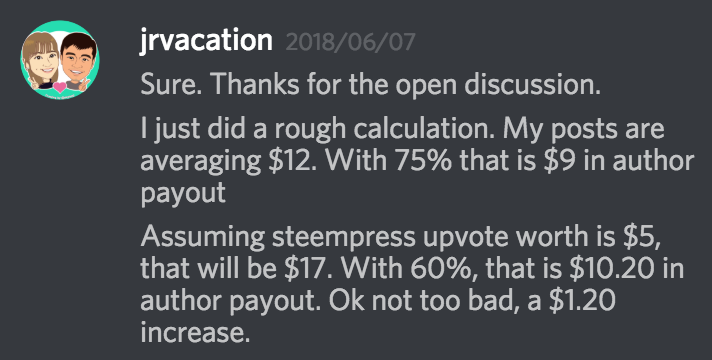 steempress のupvote はおおよそ$5(*その時は)なので合計 $17。 60%(75%-15%)だから $10.20。おお、$1.20 プラスじゃないか!悪くないわな!