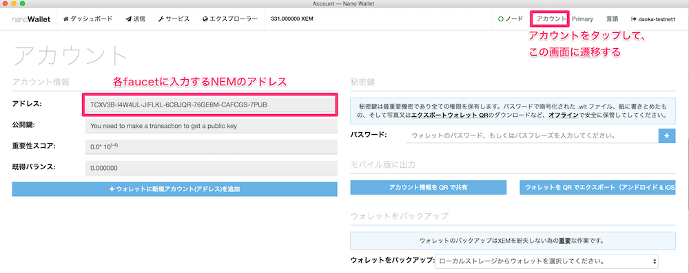 Testnet用のXEMはTestnet用のfaucet(蛇口)があるのでそこから分けてもらいます。