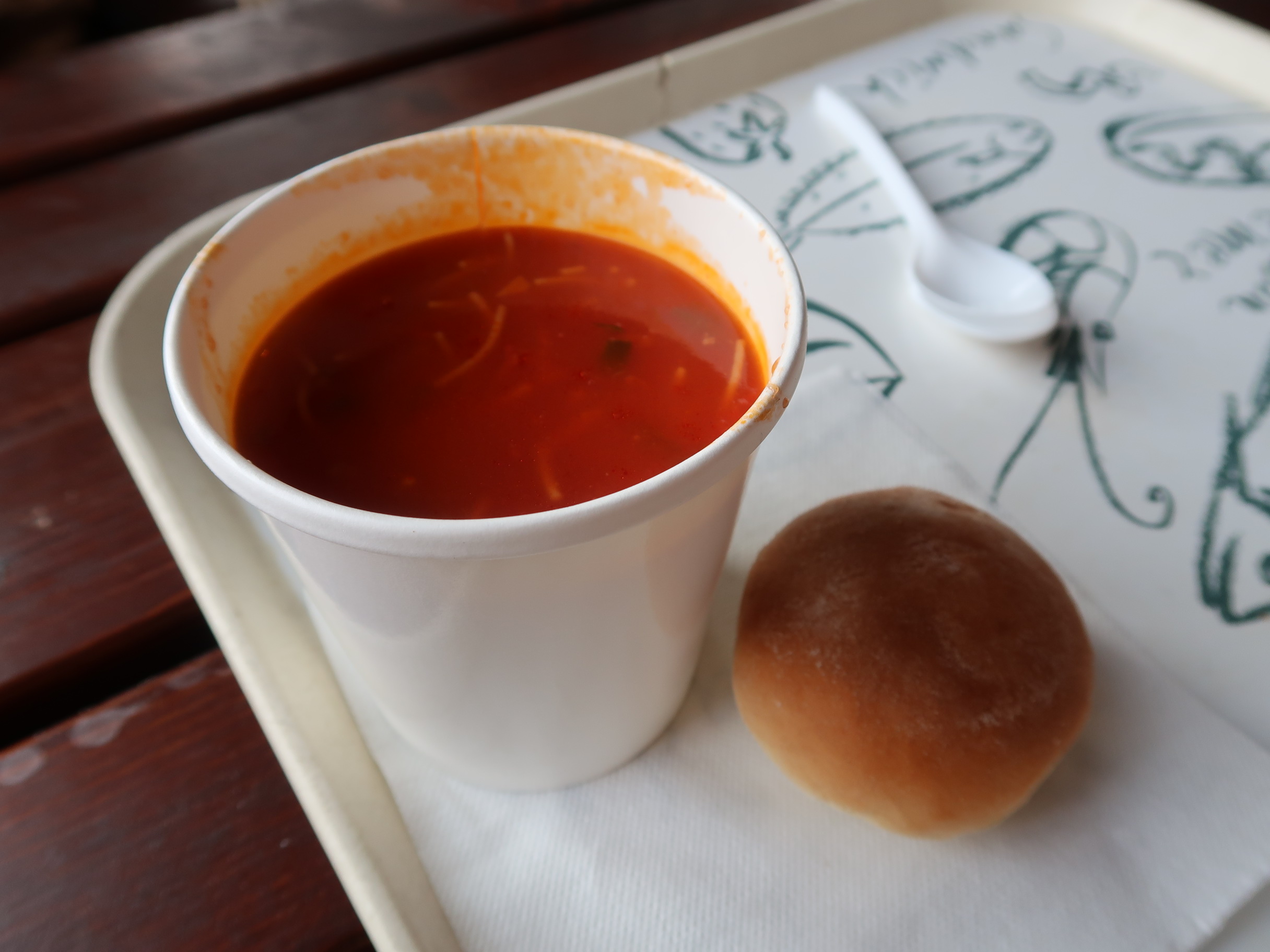 ケータリングのお店が出店していて、トマトスープとパンのセットをいただきました。