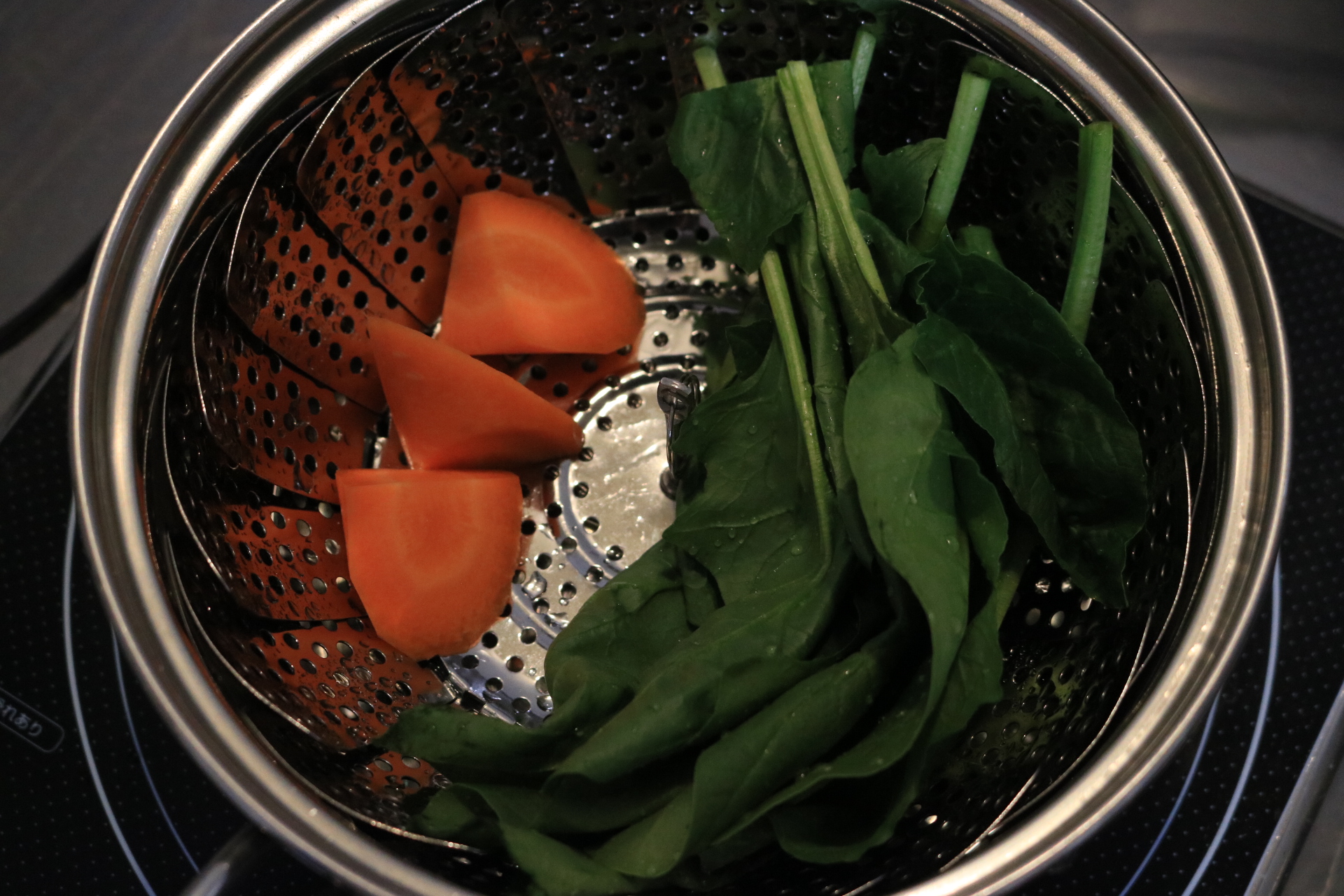 Steamed vegetables to eat together are carrot and spinach. Recently I noticed the taste of carrots. If you eat with salt it is recommended as the sweetness of the vegetables will be more felt.