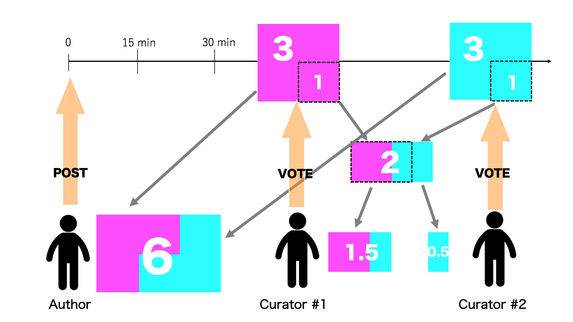 ・投稿から30分経過後に2名のキュレーターからvoteがあったと想定します。
