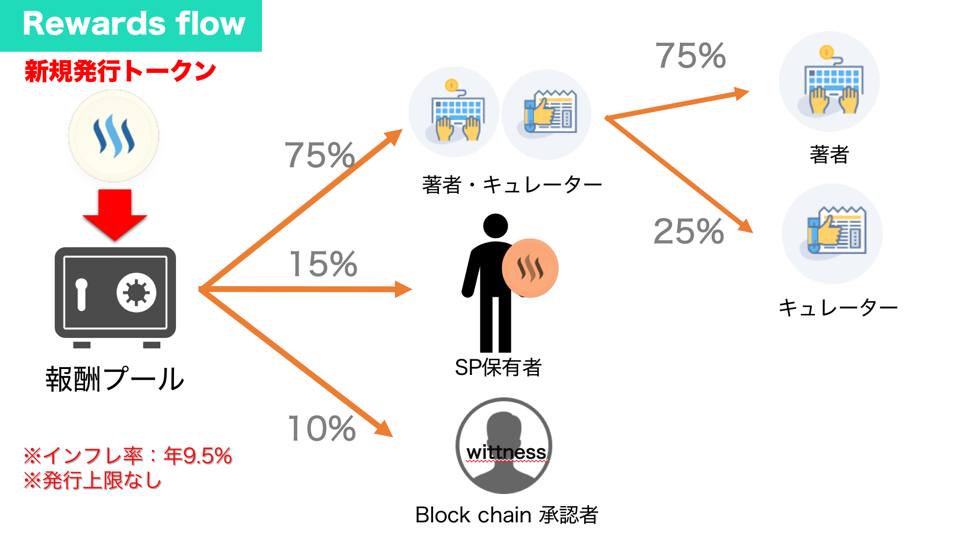 毎日発行されるトークンの75%が著者・キュレーターに分配され、さらにそこから著者へ75%、キュレーターへ25%が分配されます。