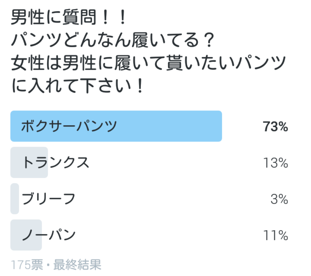 ちなみに僕はトランクス派だったのですが、まわりが圧倒的ボクサーパンツ派だったのでTwitterでアンケートをとったことがあります。