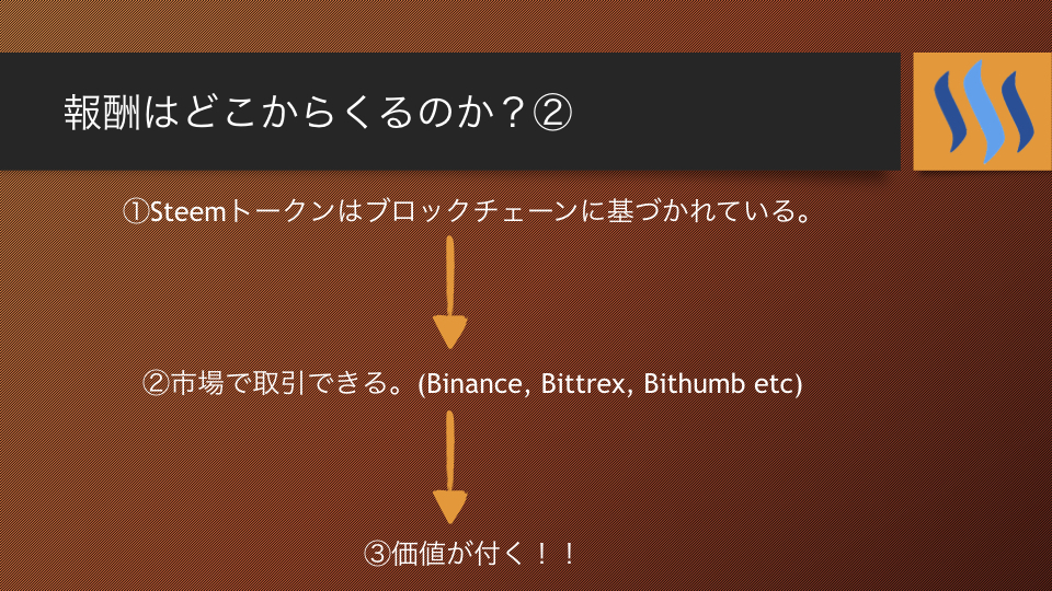 Steemトークンはブロックチェーンに基づかれているので、Binance, BittrexやBithumbといった暗号通貨取引所で売買することができます。