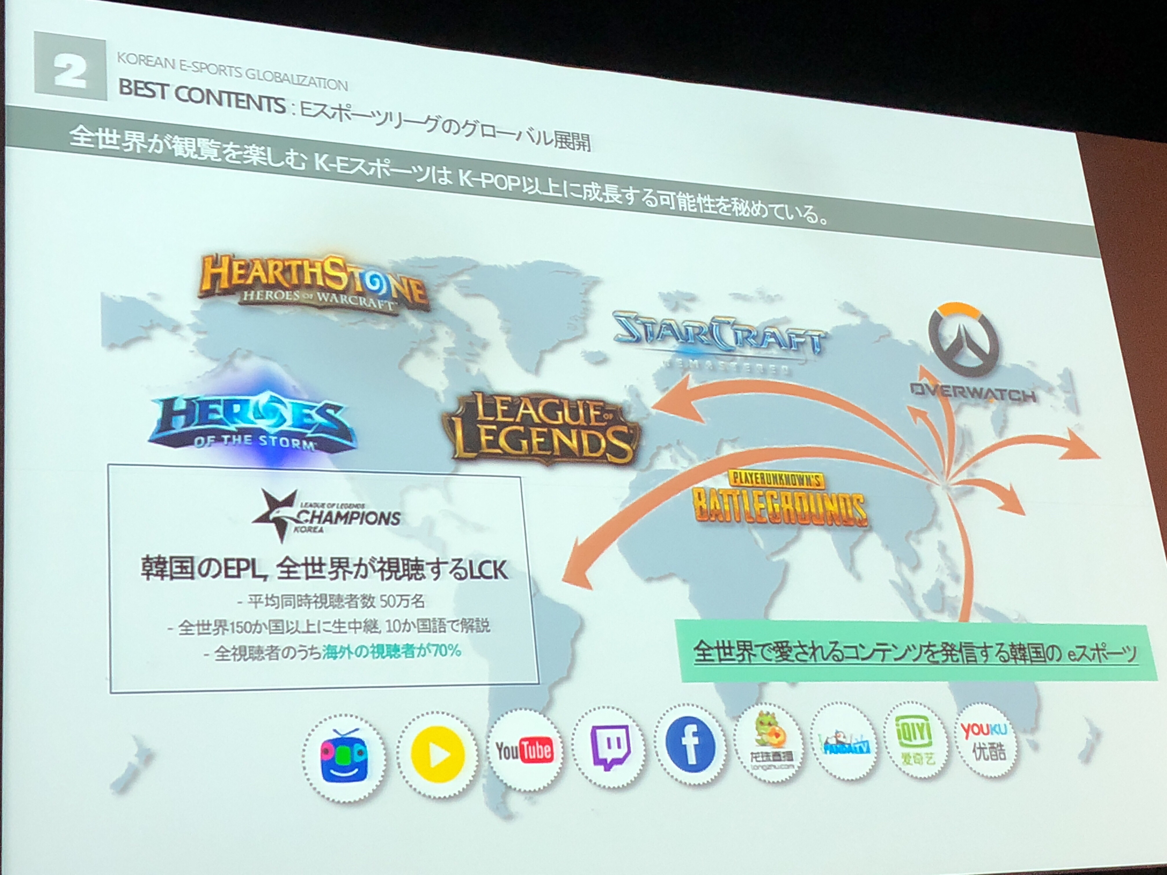 このようなeSports 生態系が成り立つ大きな基盤になるのはeSportsを観戦する人が多いとの事です。Youtubeを始め主な動画プラットフォームのライブ視聴コンテンツでesports関連のコンテンツは年々増加しており、有名なプロゲーマーがパソコンを起動し配信すると同時に200万人が時差関係無く見ているようです。