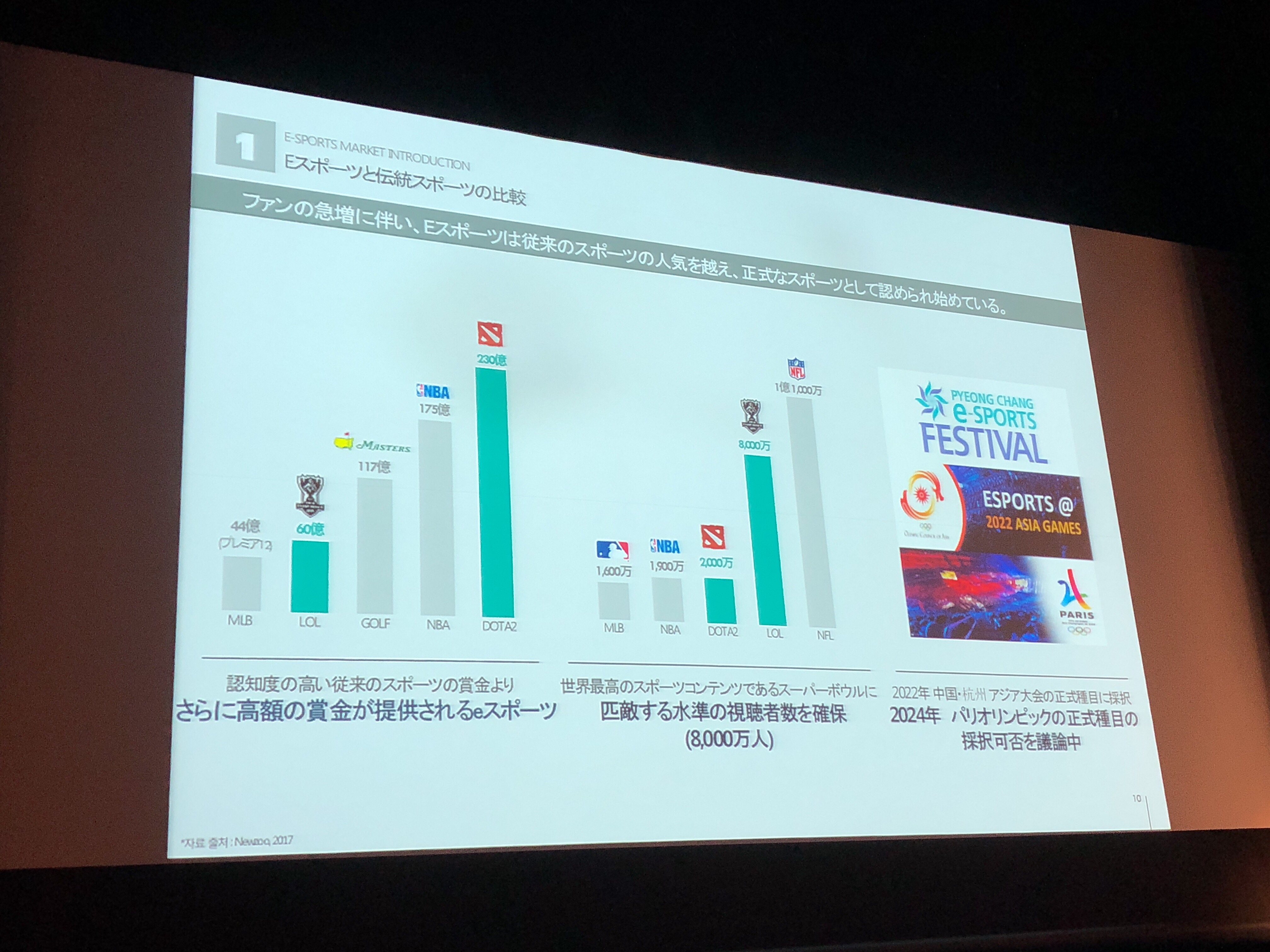 簡単に申し上げますと、体を動かす野球やサッカー、将棋など、従来のスポーツより世界ではeSportsの市場規模やビジネスチャンスそれから熱狂的なファンが爆発的に増えており、有名プロゲーマーの平均年収はすでに10億円を超えています。