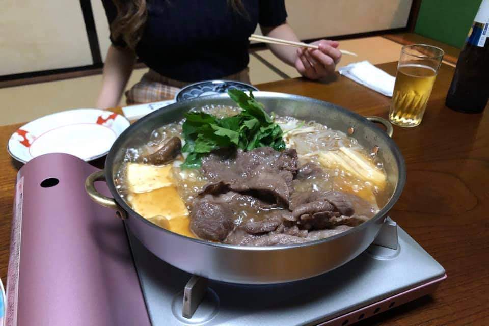 最初の1回戦までは仲居さんがお世話をしてくれます。まずは大きな牛脂を鍋底に塗り、大判の立派なお肉とネギを焼きます。割り下を煮焼く程度に回し入れ、豆腐やしらたきを投入。関西風とは違うし、関東風に近いですが、それともまたちょっと違うのが金沢風。甘めですが割り下が濃すぎず、肉自体の味を引き立てていて、私は金沢風好きだな。