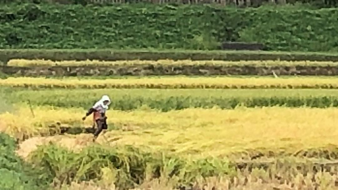 お母さんは、寝ている稲を手作業で刈ってました。
