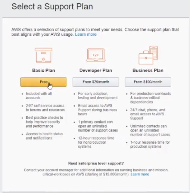 The last step for creating an account is to choose a Support Plan. For now we can stick with a Free Basic Plan.