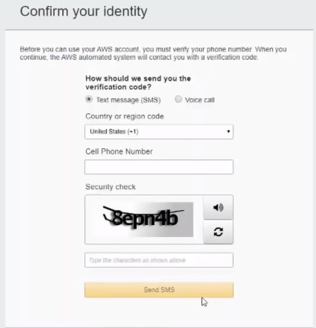 AWS will also need to confirm your identity. The next couple of steps is to add a cell number to your account. They will send a confirmation code that you will need to use in the next screen.