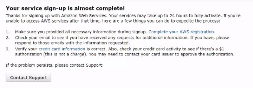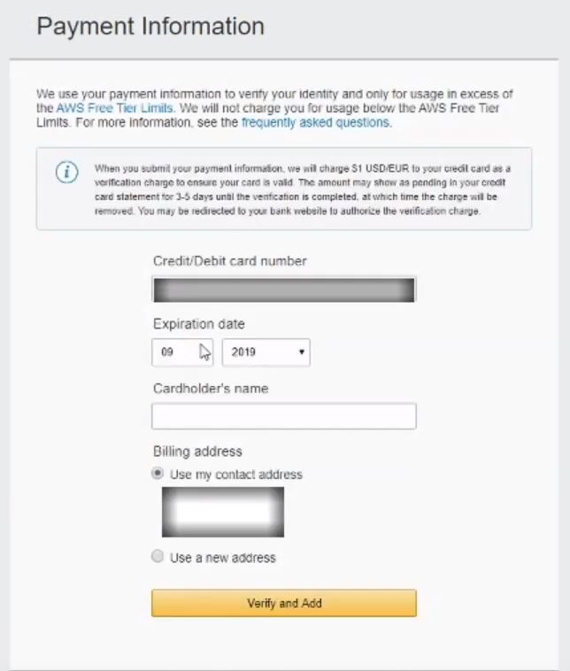A final note about submitting payment information is that AWS will charge a couple of very small amounts to the card to verify it is a legitimate account. You should be reimbursed these charges though.