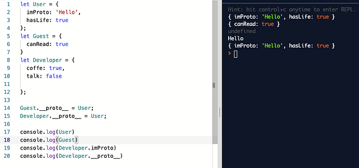 We can see that property of the Developer and it’s missing JavaScript automatically from User. In line 15 we set User to be a prototype of the Developer. Here we can say that “User is the prototype of Developer” or “Developer prototypically inherits from User”.