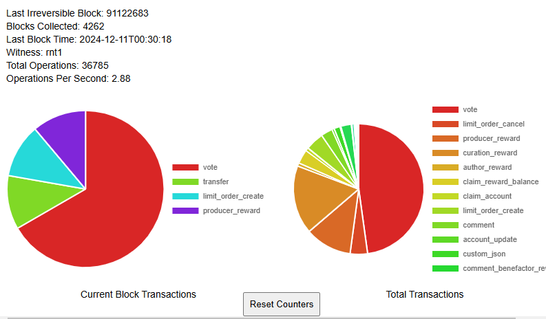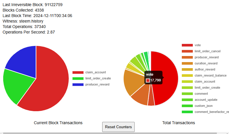 I want to build a browser extension that will query each new block on the Steem blockchain and display two pie charts. One pie chart should show the number of transactions in the last irreversible block by type. The second pie chart should show the running totals. The browser extension should also show the last_irreversible_block number, the number of blocks collected, the time/date that the last irreversible block was added to the chain, and the witness account that added it. Blocks are produced every 3 seconds.
