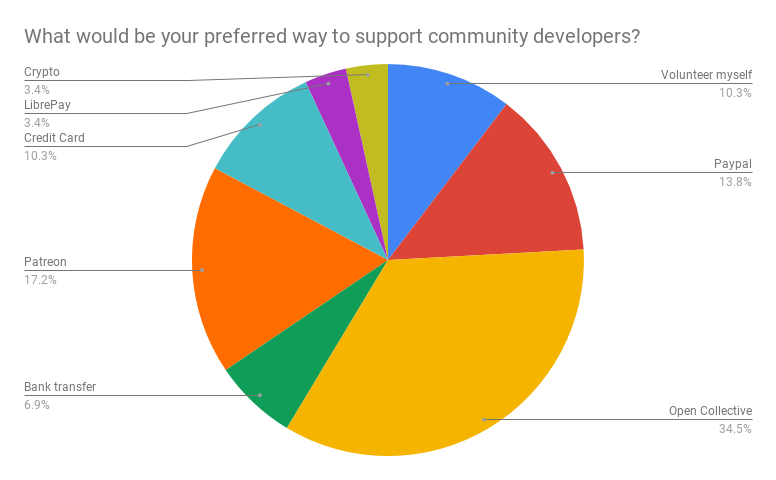 Following from the previous there have been many suggestions on which way to support. Open Collective is clearly the winner here and seems to be the way for many FOSS projects. Second is Patreon, a popular support platform in general, though there is a question of sustainability and probably not the best for org as a whole. That said, some individual developers already have Patreon. You can find more info in the related forums thread and would encourage everyone to support the developers and for developers to post where they can be supported into that thread, be it on Patreon, LibrePay, Crypto or Ko-Fi.