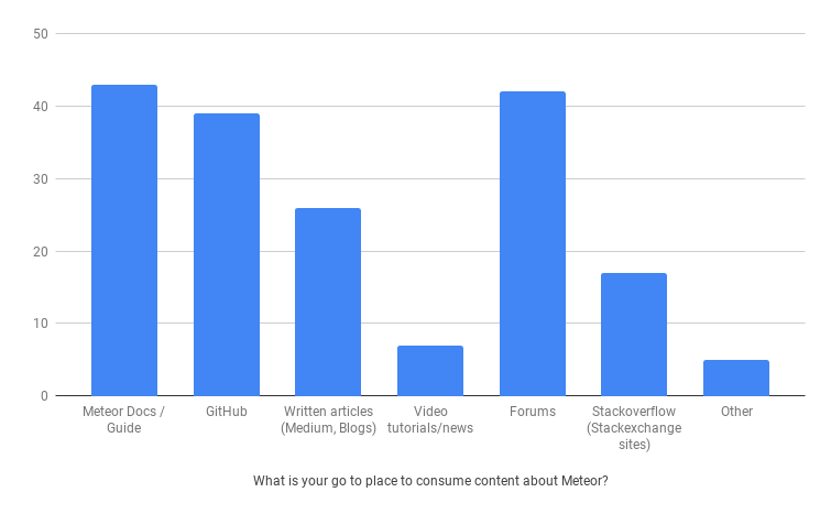With a lot of overlap, we can see that Meteor Docs and Guide are the most popular place to go for information about Meteor, closely followed by the forums. This shows how important it is that we put our efforts into improving the docs and guide as much as possible. Later we will see that it has been often identified as lacking. That is also probably why GitHub and Forums are so much visited, besides it is the place to keep a tab on development and community news.