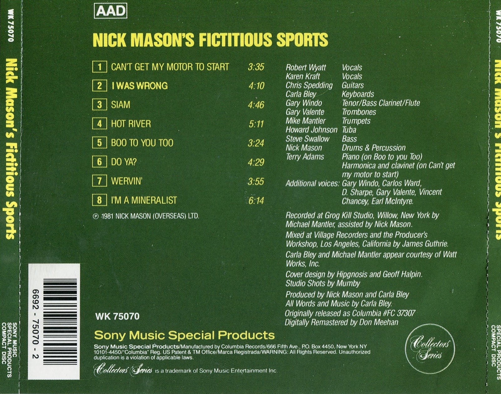 "Fictitious Sports" (released on May 3, 1981) is the title of an album made by drummer (and Carla Bley ...) ex-Pink Floyd member Nick Mason. In the work, great artists of avant-garde music and progressive rock participated as members, of which we can mention: Carla Bley on keyboards and lyrics, Robert Wyatt on voices, Chris Spedding on guitar, Gary Windo on saxophones, among others. Musically speaking the album is oriented towards sounds and melodies from jazz rock, the canterbury scene and avant-garde music, making this work a brilliant, creative album worthy of being listened to a thousand times ... =)