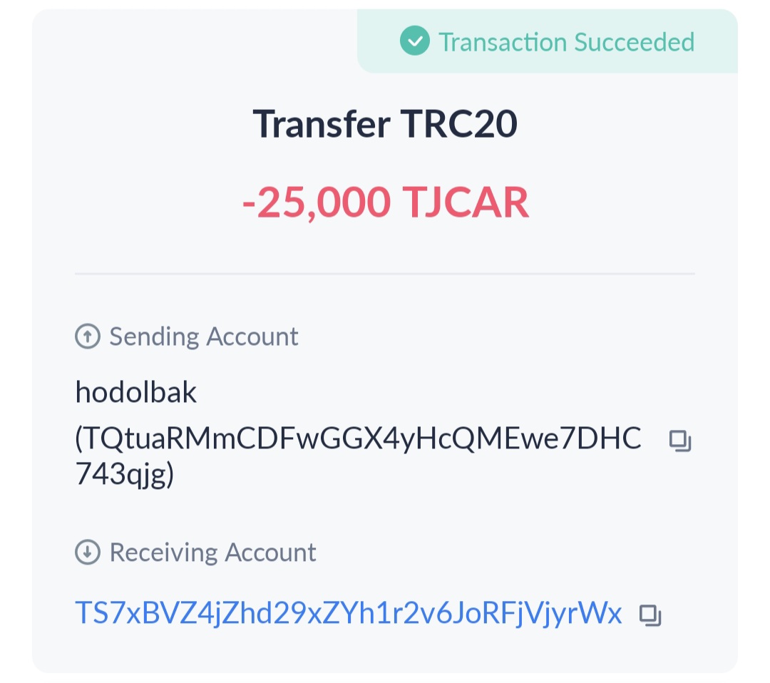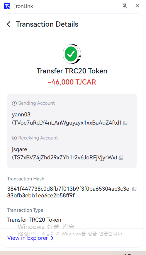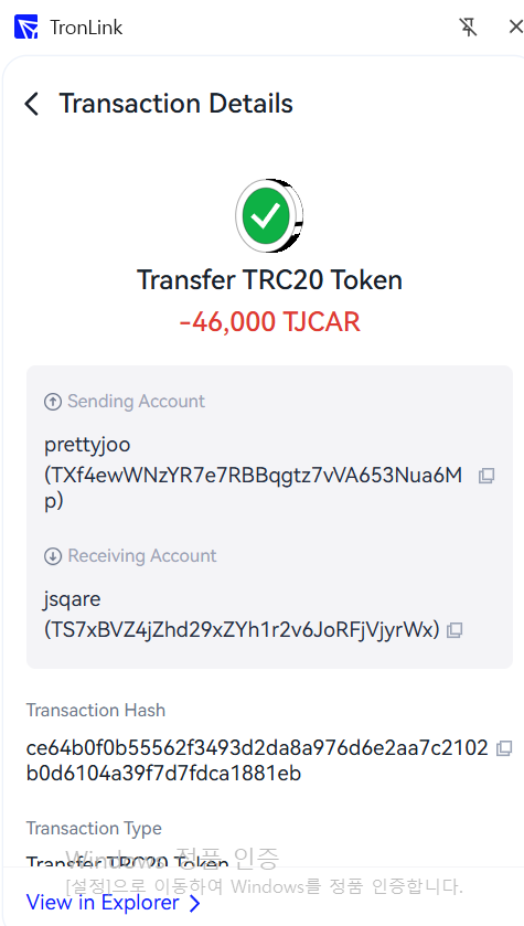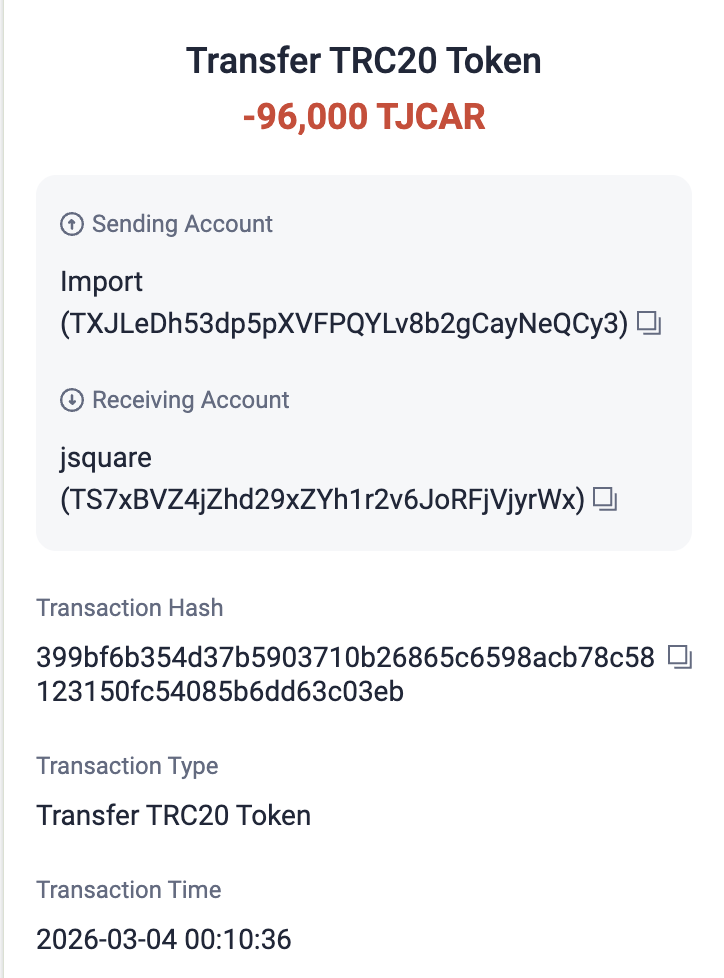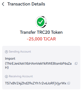• TJCAR 컨트랙트 주소 : TNHRQryXDyYSyqFHq8UqCYFSc6dzp81Dxa