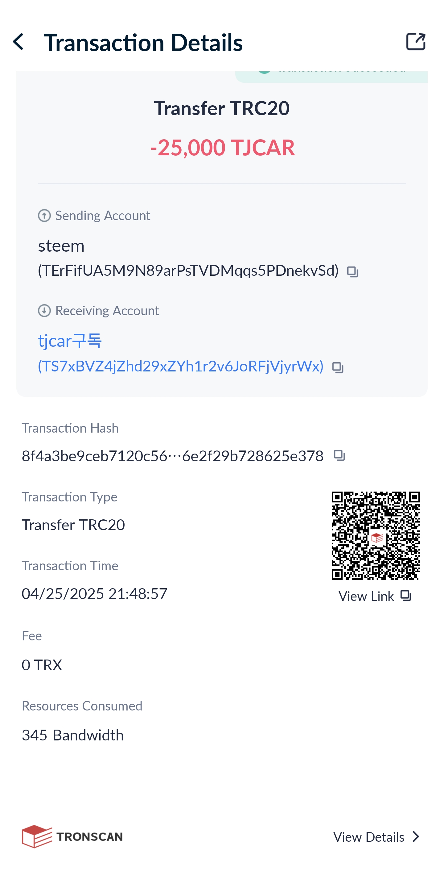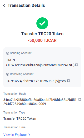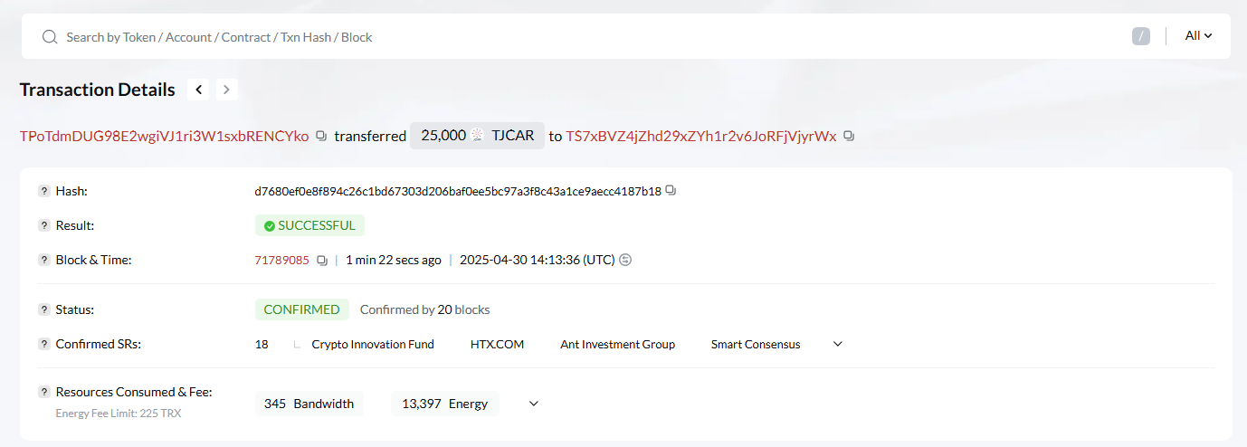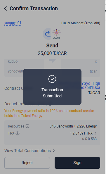 TJCAR 컨트랙트 주소 : TNHRQryXDyYSyqFHq8UqCYFSc6dzp81Dxa