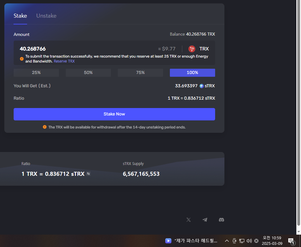 현재로서 가격도 잘 받쳐주고 있고, 현재 9.1%의 APY를 표시해주고 있어, 좀더 적극적으로 트론 스테이킹 수량을 늘려보려 합니다.
