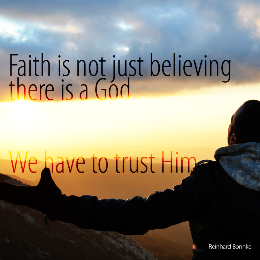 Faith is not just believing there is a God. We have to trust Him. When I get on a plane, I believe there is a pilot of course, but if for any reason I could not trust him I would quickly walk off again. I have to believe IN him. James takes us back to some of the first principles of the life of Jesus. He wrote about faith. He said “You believe that there is one God. Good! Even the demons believe that and shudder”, but - they remained demons. (James 2,19 NIV). Christians “look to Jesus the author and finisher of their faith”. Jesus did not give us something to believe, BUT SOMEBODY TO TRUST. Christianity keeps an ancient creed but believes a Person. You can’t sign on the dotted line to make you a Christian. You cannot utter a formal sentence to convert you. It is a matter of the heart, resting on Christ, moment by moment, led by His precious Holy Spirit.