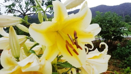 2,산백합계: 백합 중에서 가장 꽃이 크며 꽃이 깔때기 모양이고 꽃잎이 깊게 갈라지며 옆으로 향해 핀다 합니다