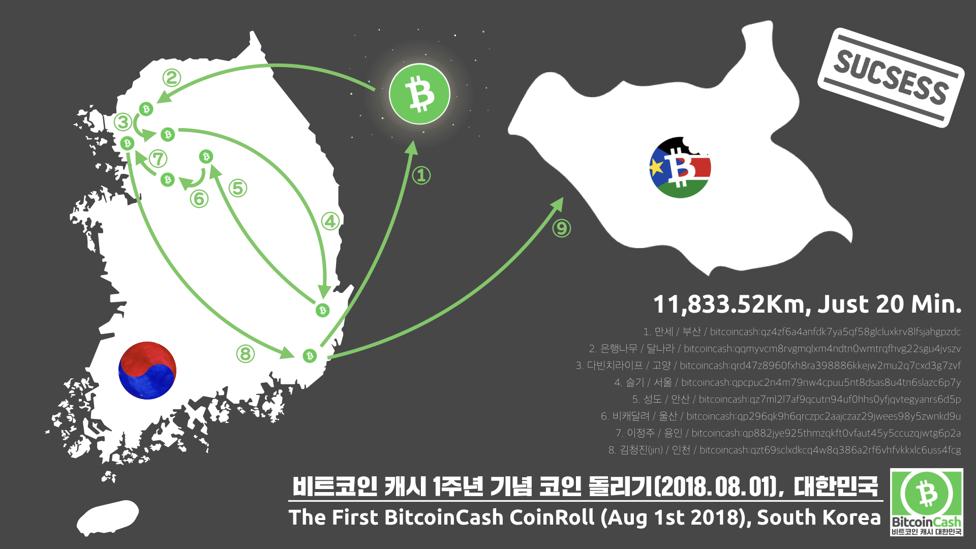 총 8명의 참가자가 모집 됐구요. 한국시간 8월 1일 밤9시 정각 제가 첫번째 주자로 10달러를 2번 주자에게 전송하며 동전돌리기가 시작되었고 2번 주자는 받은 금액을 3번주자에게, 그리고 4번,5번에게 넘기고 넘기고 해서 마지막 8번주자에게까지 BCH 코인이 도착한 후 다시 1번 주자인 저에게 전송이 되었고. 저는 준비해뒀던 코인을 더해서 남수단에서 비트코인캐시로 봉사활동을 하고있는 남수단 비캐봉사단( https://twitter.com/eatBCH_SS )에게 모든 금액을 전송하며 성공적으로 마무리가 되었습니다.