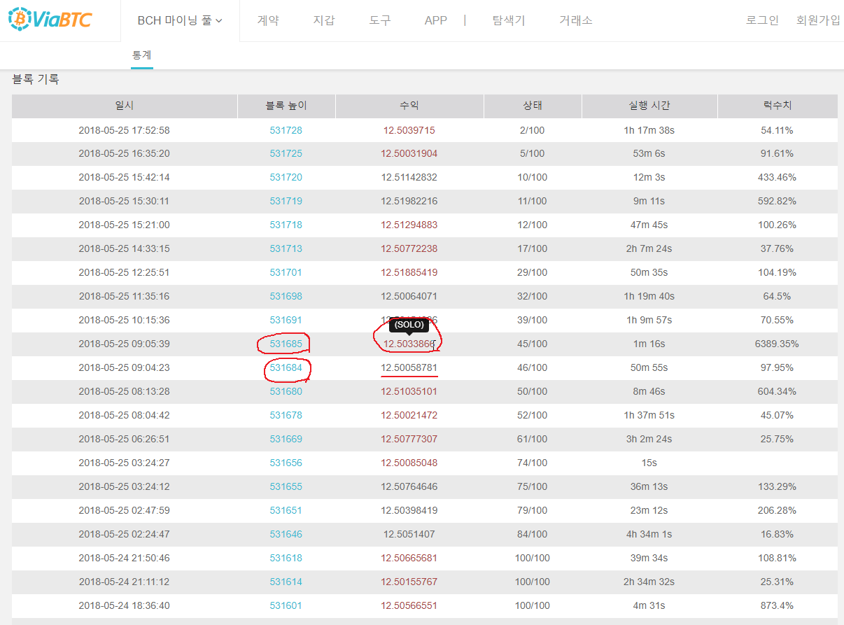 참고로 (SOLO) 라고 적혀있는 빨간색 칠해진 블럭은 ViaBTC 풀에서 채굴이 되었으나 채굴보상이 viaBTC로 가는게 아닌 CoinGeek 으로 할당된다는 뜻입니다. 이것은 /ViaBTC/coingeek.com 으로 채굴된 블럭의 보상은 viaBTC와 무관하다는 뜻입니다.